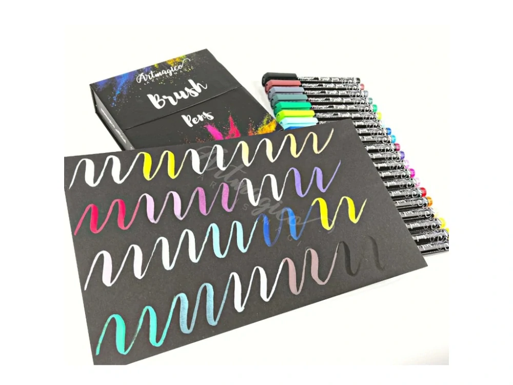 Artmagico Brush pens - spojují výhody dvou malířských nástrojů - fixů a štětce. Brush peny jsou fixy s hrotem, který je podobný štětci. Takový hrot je vysoce přizpůsobivý a zvládnete díky němu vytvořit různé tloušťky linky. Linka se mění od tenké po širokou v závislosti na tlaku vyvíjeném na hrot. Dosáhnete tak snadno linky tloušťky od 1 do 3 mm. Brush peny jsou univerzálním nástrojem a využijete je při kaligrafii, letteringu, psaní, malování, scrapbookingu, ale také vybarvování. Sada obsahuje 20 perfektně krycích fixů. Jejich vlastnosti využijete jak na bílém, tak černém povrchu. Fixy jsou díky svému inkoustu použitelné na všechny povrchy - černý i bílý papír, kámen, plast, železo, dřevo a další. Při použití na neporézní povrch je potřeba nechat inkoust řádně zaschnout a následně zalakovat.