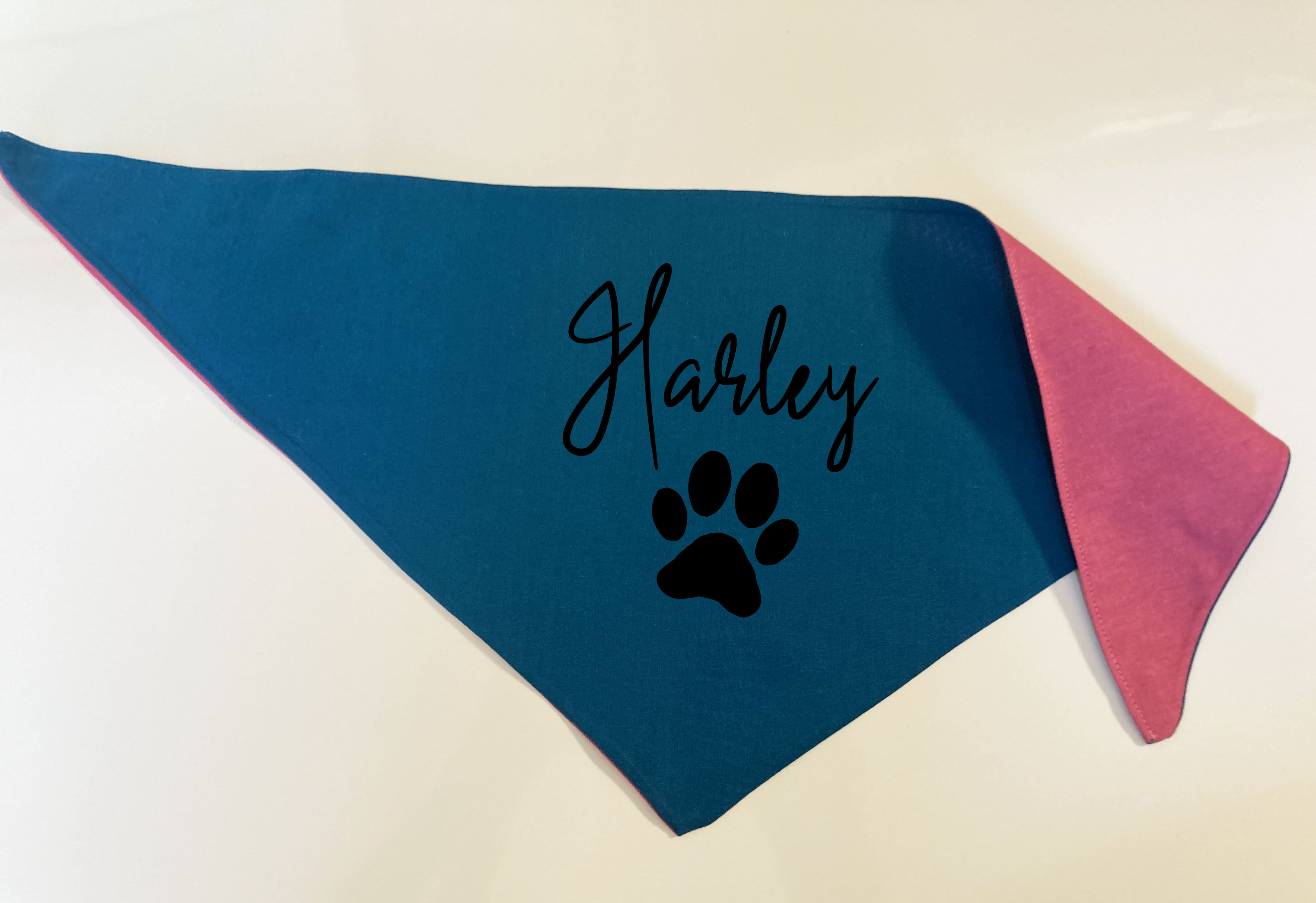 Šátek pro psa se jménem, Tmavě modrá-světle červená-černý potisk350 Kč/ ks289 Kč bez DPH